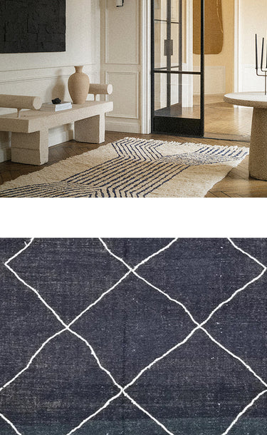 Les tapis Beni Ouarain sont les icônes du tapis marocain minimaliste. Tissés par les tribus berbères de l’Atlas avec de la laine naturelle non teinte, ils arborent des tons ivoire doux et des lignes noires ou brunes simples. Leur esthétisme moderne et leur texture cosy les rendent universellement appréciés.
